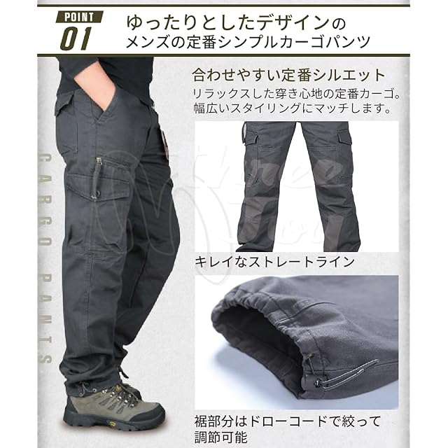 【デザイン】定番のカジュアルカーゴパンツ。飽きのこないカラーで、年間通して使える万能アイテムです!適度なゆとりがあり、履き心地抜群です。仕事着や普段使いにはもちろん、キャンプやハイキングなどのレジャーにも活躍してくれる1枚です。