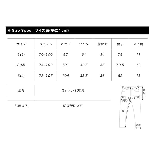 サイズ:2(M) ウエスト:72〜96 ヒップ:102 ワタリ:34 前股上:38 股下:79 裾巾:11