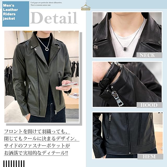 テカリをおさえた上質なPU合皮を使用しているので、傷に強く、雨の日も着用できるのが嬉しいアイテム。フロントを開けて羽織っても、閉じてもモードな雰囲気でクールに決まるデザイン。