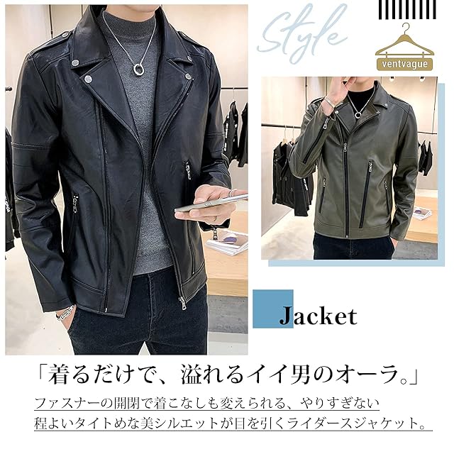長年人気のライダースジャケットをオトナかっこよく決まる美シルエットに仕上げたアイテムが入荷いたしました!!レザー調で羽織るだけでクールに決まる、イイ男オーラが溢れるジャケットです。