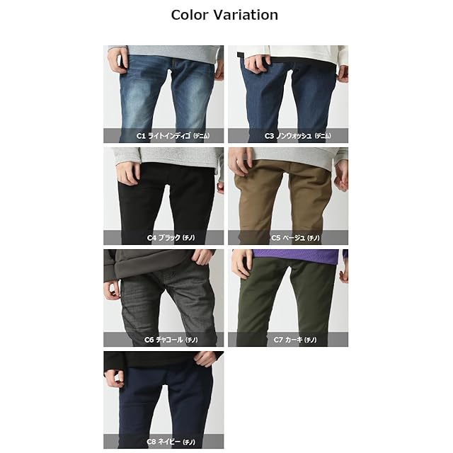(デニム)綿75%,レーヨン23%,ポリウレタン2%,(チノ)レーヨン75%,ナイロン20%,ポリウレタン5%