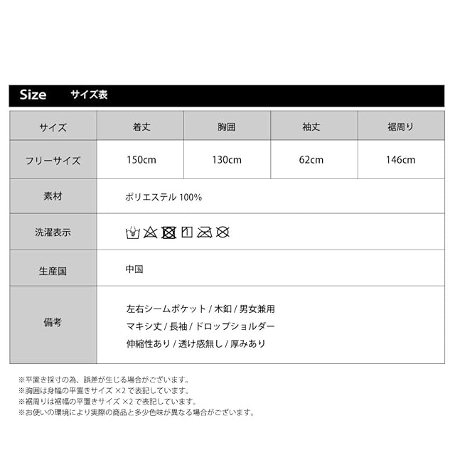 【素材】ポリエステル100% 【備考】左右シームポケット / 男女兼用 / マキシ丈 / 長袖 / ドロップショルダー / 伸縮性あり / 透け感無し / 厚みあり / 木釦
