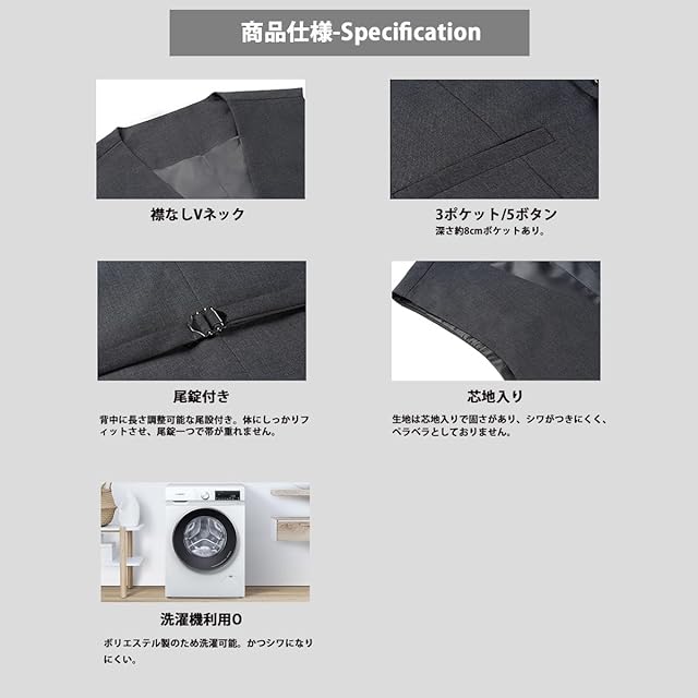 【クラシックデザイン】スーツのベストの設計はシンプルで寛大で、ビジネスと正式な場所に適します。スタイリッシュな英国風Vネック、左胸のポケットはポケットにはガム、チケット、名刺などの軽い小物に入れられます。左右の二つのポケットは糸を外してから使えます。5つのボタンがあり、ボタンの開閉で雰囲気を変えることができます。ベストの後ろは尾錠付き、自分に合うウエストを調節することが可能です。すっきりしたシルエットが上品でシックな印象を与え、着やせ効果も抜群!