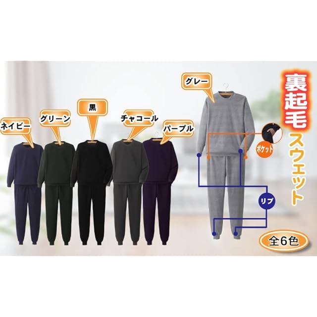 秋冬の寒さ対策にぴったりな裏起毛スウェット上下セット。厚手素材の暖かさと快適さを両立し、普段着やリラックス時の部屋着としても最適。