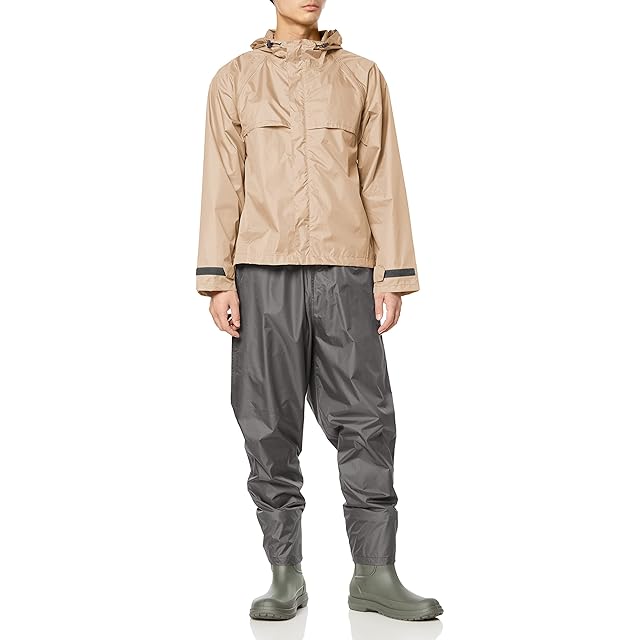 【本体仕様】ジャケットサイズ:107×81×70㎝/パンツサイズ:65-98×64.5×96.5㎝/ジャケット重量:230g/パンツ重量250g/ジャケット素材:ポリエステル100%・ポリウレタン透湿コーティング(浸透度5,000g/㎡-24h)/パンツ素材:ポリエステル100%・ポリ塩化ビニル引き・はっ水/ジャケット耐水圧:8,000㎜H2O/パンツ耐水圧:10,000㎜H2O/カラー:グレージュ/サイズ:M/収納袋付