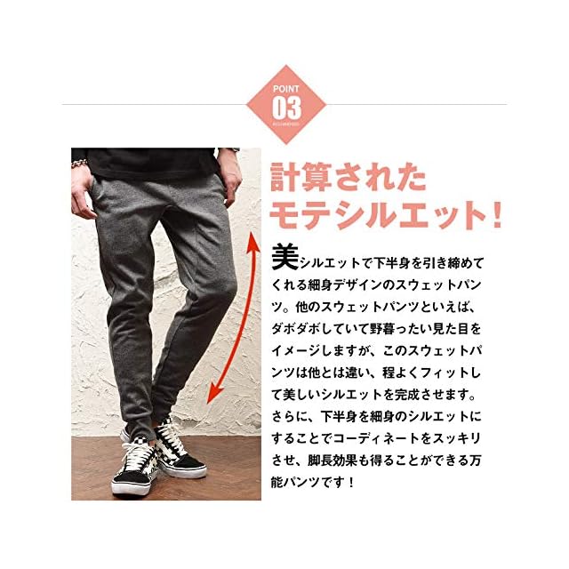 【伸縮性抜群で着心地◎なスウェット素材】美脚シルエットに加え、穿き心地、動き易さを両立しました。独特の滑らかさはずっと着ていたくなる魅力の肌触りです。 細身に見せたいけど、窮屈な着心地は嫌だ。。という人こそ是非お試しください。
