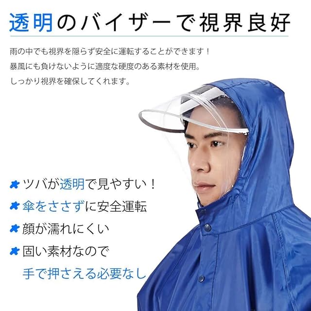 【大きめ丈夫なバイザー】PVC透明膜デザインを採用し、防水性が高くだけではなく、光も強く見えるようになる、視界が悪い日でも心配は無し!レインコート 自転車 ポンチョ大風でも、ツバがめぎりあがりがなく、防水膜を使用で、服を濡れにくく、大雨でも安心!女性に嬉しい化粧崩れも防げます♪