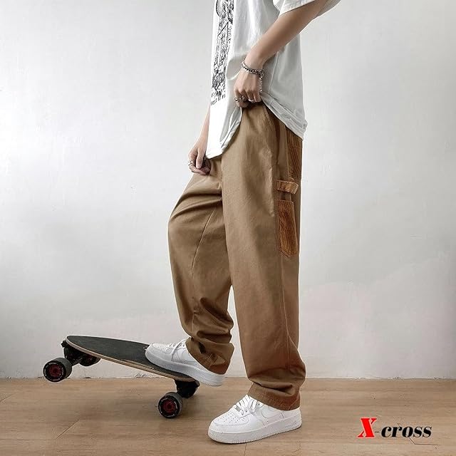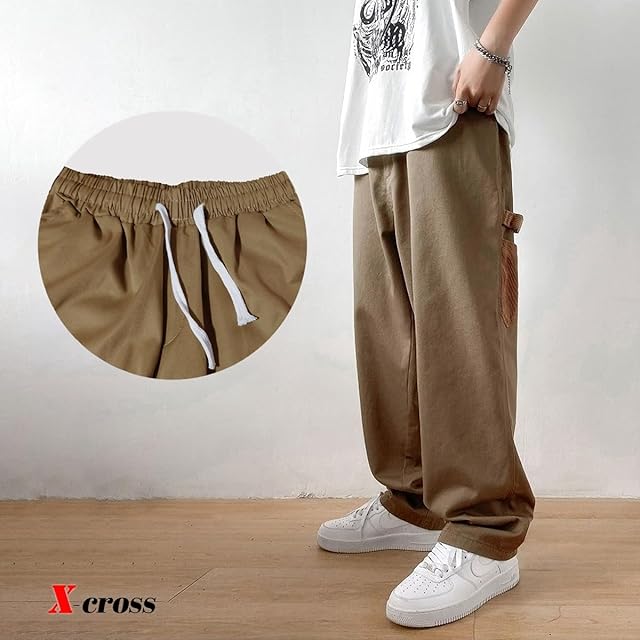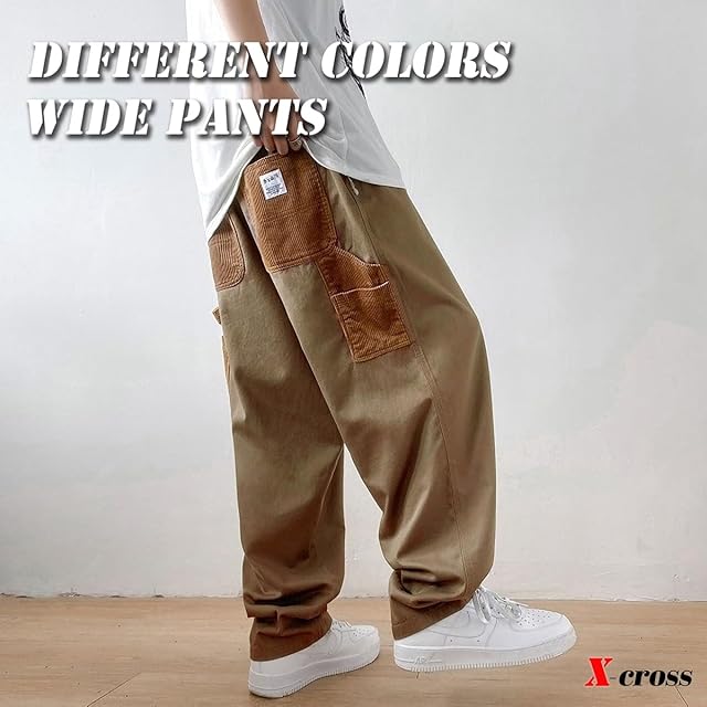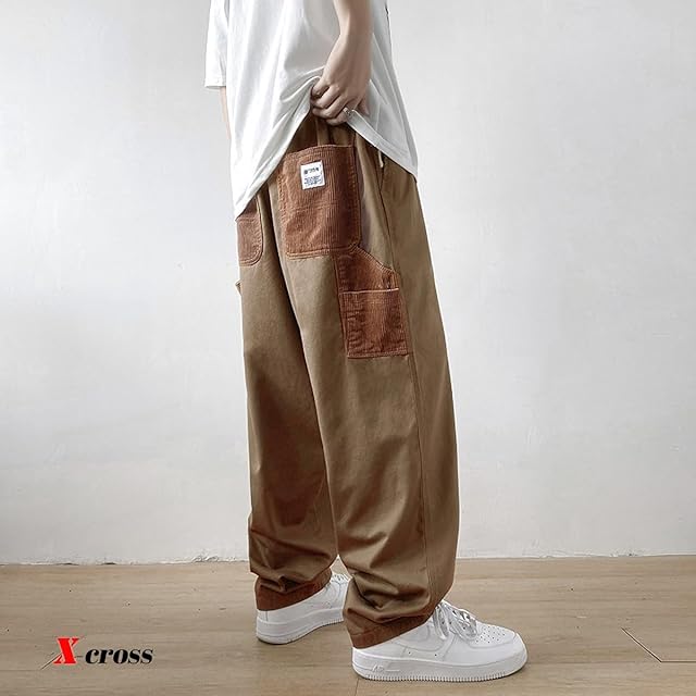 [X-cross] クロス カーペンターパンツ メンズ ワークパンツ 大きいサイズ ゆったり カーゴパンツ 作業着 ペインターパンツ コーデュロイ ポケット カジュアル ウエストゴム ベルトなし 薄手 太め オシャレ 韓国 ストリート系 ファッション コーデ かっこいい 紐付き ドローコード ロングパンツ リラックスパンツ サイドポケット ズボン アウトドア 部屋着 (L) ブラウン