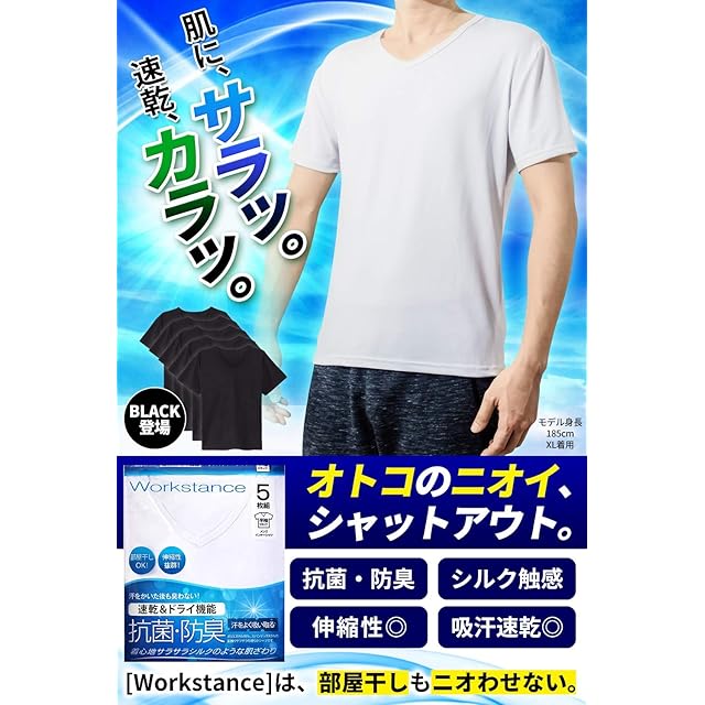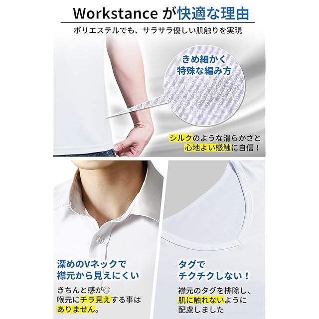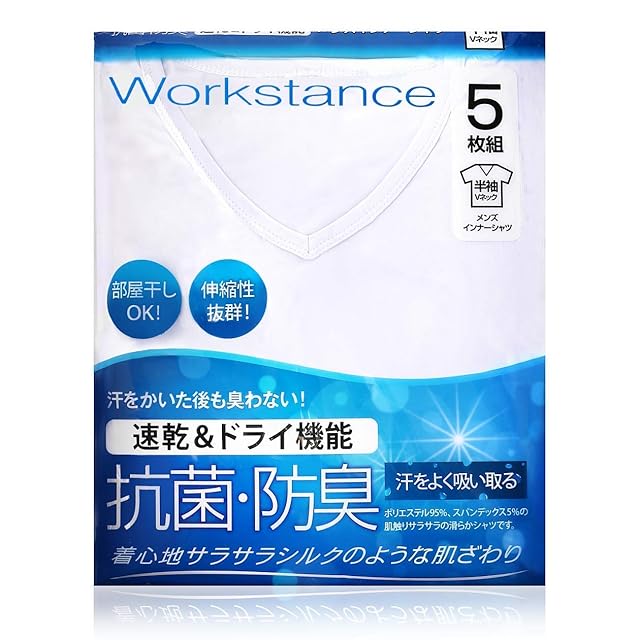 【WORKSTANCE】は抗菌防臭に優れた深めのVネックインナーシャツです。汗を掻いた後の嫌なニオイをシャットダウンし、常にサラサラ状態をキープします。
