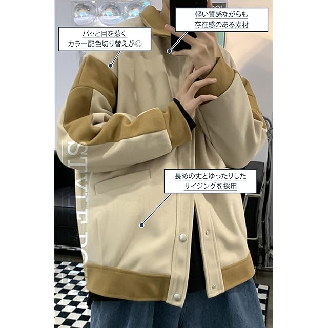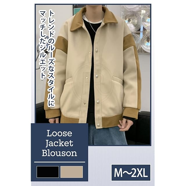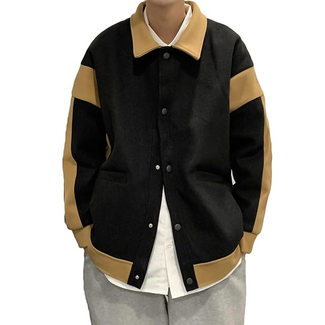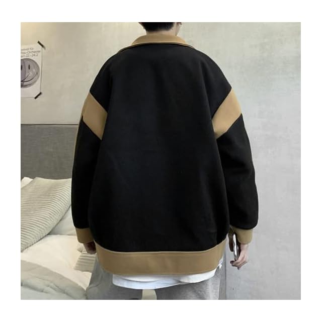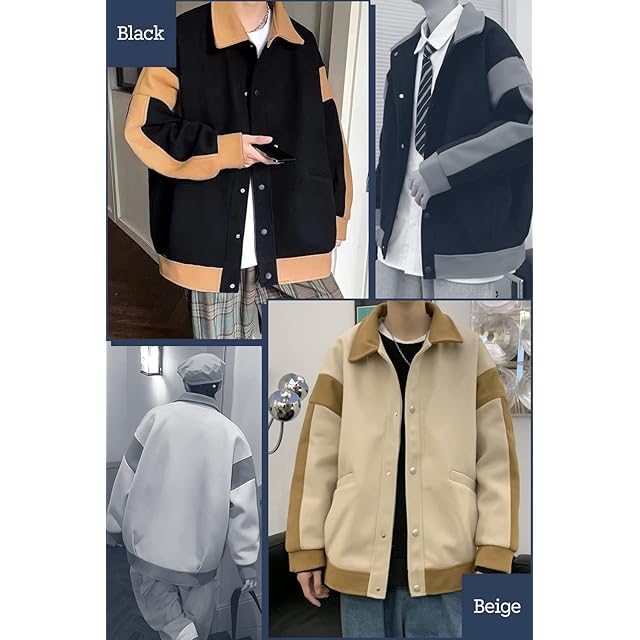 [リディーコロ] バイカラー カジュアル ジャケット ドロップショルダー メンズ ブルゾン コート スナップボタン 厚手 防寒 防風 暖かい 春 ワイド 長袖 韓国風 ラフ オーバーサイズ ビッグシルエット 秋服 秋物 秋春 春服 春物 秋 秋春物 アウター 大きいサイズ ゆったり カーキ アメカジ トレンド 大きめ ボタン ストリート 韓国 お洒落 パーカー ジャンパー ブラック L