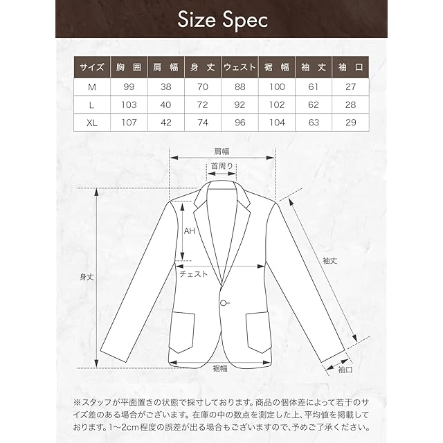 比較的タイトなデザインとなっておりますので、腕周りが太めの方・胸板が厚めの方はワンサイズ上の商品を購入することをお勧めいたします。