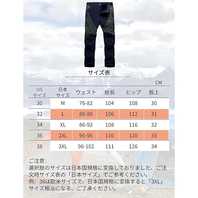 機能紹介:1.防寒性、防水性、透湿性、防風性、耐摩耗性、伸縮性あり、様々な環境に対応できます。 2.裏地には柔らかな起毛素材を使用しており、高い防寒性と肌に馴染む快適な着心地を与えてくれます。 9.ヒザ部分は人間工学に基づいてデザインとなっており、足の活動スペースを大きくして、屈折に干渉することはありませんので、スムーズに動けて体に負担を減らされます。