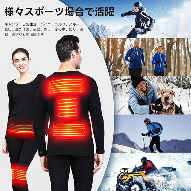 【様々場合で活躍の電熱インナーウェアセット】真冬の寒空の下でのツーリングや、夜釣りに出かけたりする楽しみがあります。キャンプ、日常生活、バイク、ゴルフ、スキー、登山、屋外作業、夜勤、旅行、家の中、釣り、通勤、通学などにも活躍です。 30代 、40代 、50代 、60代、70代にもお勧めいたします。母の日、敬老の日、父の日、クリスマス等の日は、プレゼントとして最高です。
