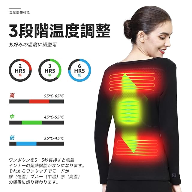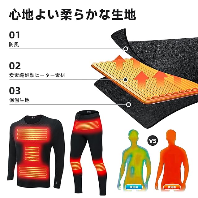 【即暖&ヒーター6箇所の電熱ウェア】日本製電熱トップスと電熱パンツの合わせて6箇所の加熱ヒーターが内蔵され、暖かさを逃げさない、全身ポカポカします!炭素繊維製加熱素材を使用して、熱伝導率高いで、お腹、肘、太もも、腰、背中、膝、ふくらはぎ を60秒内にポカポカと温かめます。真冬でも、この電熱 インナーを一着あれば、冬を楽しむことができます。