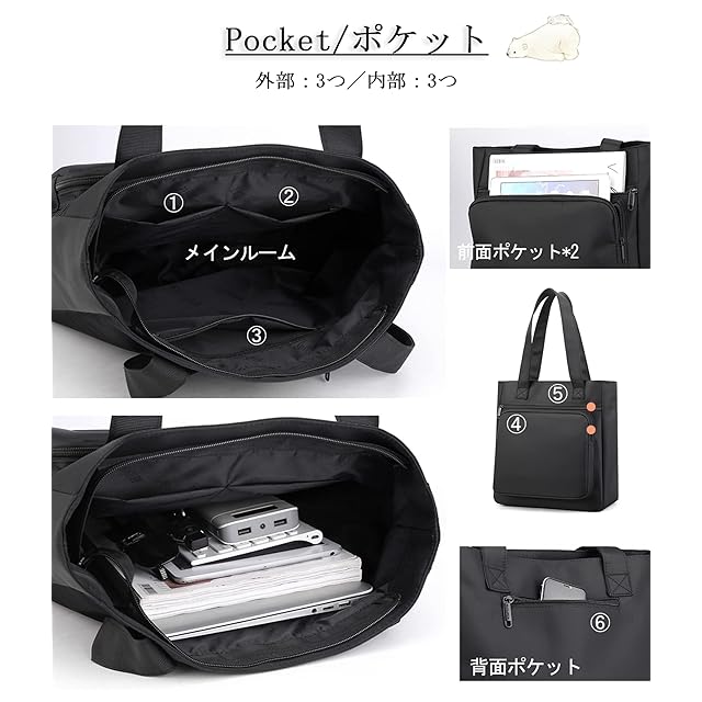 【大容量・軽量】(ポケット:メインルーム1つ/外側3つ/内側3つ)A4サイズ収納可能で、14インチのタブレットやノートパソコンまで楽々入る大容量です。または、手帳、スマートフォン、書類、折り畳み傘、雑誌、化粧品など必要な物もたくさん収納可能です。なお、天面にジッパーがあるので、防犯面やプライバシー面でも安心。内側にも貴重品用ジップポケット1つ、オープンポケット2つ付いていますので、財布、カードなどにふさわしく、落としモノはゼロであるように頑張りましょう。また、サイドポケット2つはメッシュ仕様で、500mlのペットボトルの収納ができます!大容量なのに軽量です。