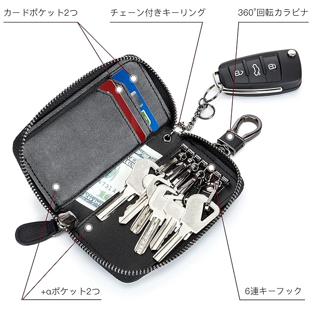 ✅【多機能】●気軽に日常用品を収納できます。例えば、車の鍵、家の鍵、クレジットカード、スマートキー、電車の定期券、免許証、門限カード、紙幣の小銭、ドアの鍵等が入れられます。忘れたりと無くしたりを心配する必要はなく。●スマートキー専用、ファスナー式でしっかりと収納できるスマートキー専用ケースです。チェーン付きキーリングも付いているので、家の鍵や大切な鍵なども一緒に収納できます。●カラビナ付き、ラウンドファスナーで大きく開き、鍵の出し入れがスムーズにできます。軽量で手のひらに収まる、ほどよいサイズ感の使いやすいキーケースです。360度回転する便利なカラビナ付きで、ズボンやバッグなどに引っ掛けることができます。●シンプルでオシャレなデザインは、メンズ、レディース問わず長くお使いいただけます。大切なスマートキーや鍵をすっきりスリムに携帯できる収納ケースです、男女兼用で、プレゼントとしてもピッタリです。