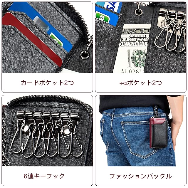 ✅【大容量収納】◆カード6枚&鍵7本/8本 ●6連キーフック×1 ●外側カードポケット×2 ●内側カードポケット×2 ●+αポケット×2 ●チェーン付きキーリング×1。