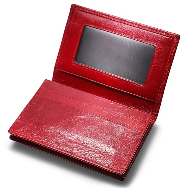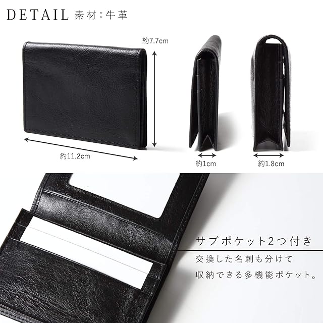 【商品詳細】 素材:牛革(ビンテージ加工) サイズ:約11.2㎝×7.7㎝×1.8㎝ カラー:ブラック・キャメル・ブラウン・レッド 収納:名刺約50枚収納可能/メインポケット×1 サブポケット×2 クリアポケット×1