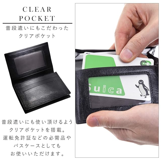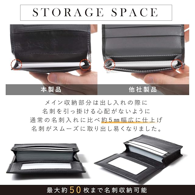 【機能性抜群】 メイン収納部分を幅広に仕上げ、使いやすさにこだわった本革名刺入れです。名刺を引っ掛ける心配が無いのでスムーズに取り出す事が可能。普段使いに便利なクリアポケット付きで、運転免許証や交通系ICカードの収納にもお使い頂けます。