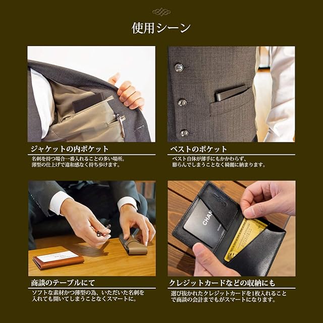 スーツの内ポケットに ベストのポケットに ビジネスバッグに どこに収めても邪魔にならない存在感 標準的な厚さの名刺であれば20枚程度収納OK