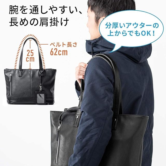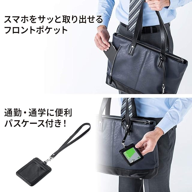 [サンワダイレクト] トートバッグ 大容量 9ポケット A4 / 13.3型PC収納 ペットボトルホルダー・パスケース付 ファスナー付き オールネイビー 200-BAG153NV2