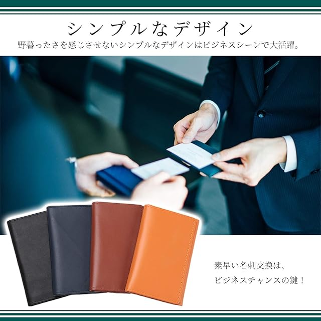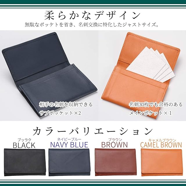 ■無駄を省いたシンプルなデザイン メインポケットが1つとサブポケットが2つ。無駄を省き名刺交換に特化したジャストサイズです。薄型ながらメインポケットには30枚程の名刺が余裕で収まります。サブポケットには相手の名刺を収納できます。ベーシックカラーな4色は、どれもシーンを選ばない落ち着いた色味です。