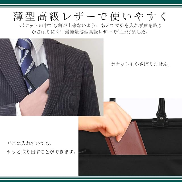 ■取り出しやすい極薄タイプ とても薄くて軽く、ポケットからすっと取り出せます。薄くなめした高級レザーを使い、底にマチを付けていません。ポケットが不格好に膨らまず、出し入れがスムーズ。ポケットの小さい女性にもおすすめです。もたつかず素早く名刺交換ができ、ビジネスシーンで活躍します。
