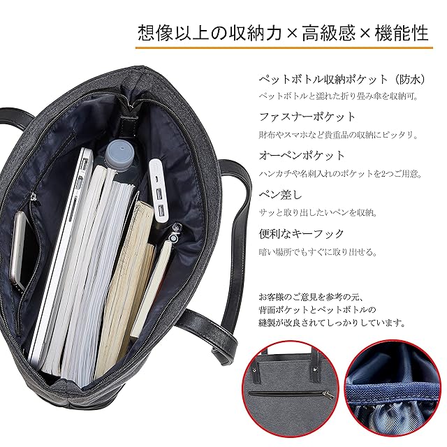[たっぷり収める収納力で仕事をサポート]A4ファイルやノートPCが楽に収納できる、余裕のキャパシティ。マチのあるので、上着やお弁当など、かさばるものもすっきり収納します。中にはオーペンポケット2つとペン差し2つ、ファスナーポケット1つを用意し、携帯やハンカチなどの細かいものも整理がしやすい設計に。口が大きく開くファスナーで、中の荷物の出し入れもスムーズにできます。