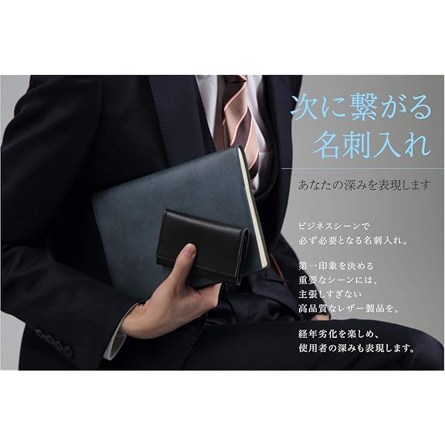 ビジネスシーンで必ず必要になる名刺入れ。第一印象を決めるアイテムでもあるため、主張しすぎず高品質なレザー製が一番。経年変化での綺麗な発色で、使用者の深みも表現します。