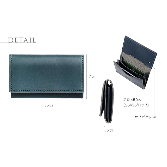 素材:栃木レザー100% サイズ:縦7cm×横11.5cm×厚み1.5cm 収納:名刺50枚(25×2ブロック)、サブポケット×1