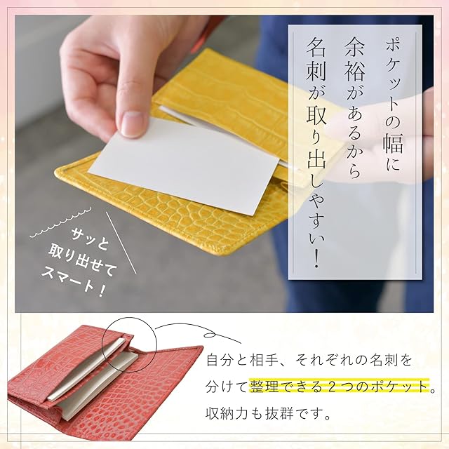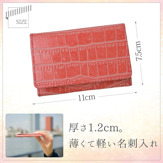 【軽くて薄い、ポケットにも収まるコンパクトさ】横11cm、縦7.5cm、厚みは1.2cmしかありません。ジャケットのポケットに入れても膨れることがないので、スマートなシルエットを保つことができます。また、名刺を入れるポケットの幅は余裕を持たせていて、名刺交換の際は名刺をサッと取り出すことができます。可愛さと機能性の両方を兼ね備えた名刺入れです。