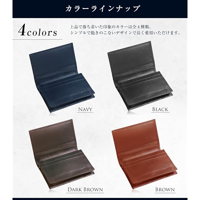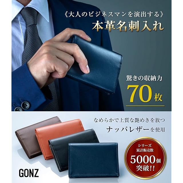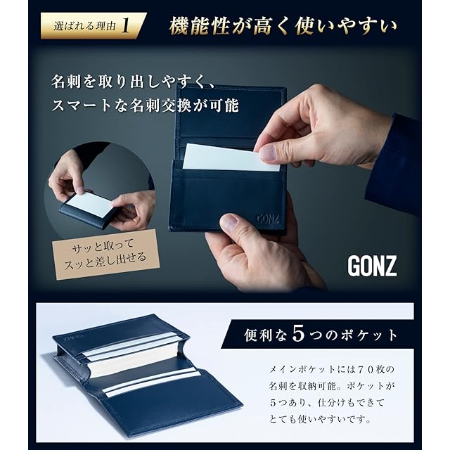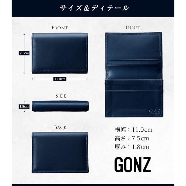 【商品詳細】◎ブランド名:GONZ ◎素材:牛革 ◎カラー:ネイビー、ダークブラウン、ブラウン、ブラック ◎サイズ:横幅11cm×高さ7.5cm×厚み1.8cm ◎ポケットの数:メインポケット1つ、サブポケット4つ ◎用途:名刺入れ、名刺ケース、カードケース、パスケース ◎仕様:セパレート内部仕様