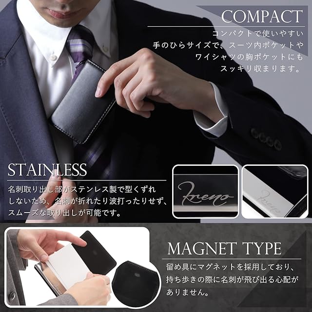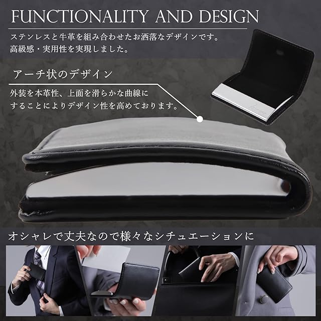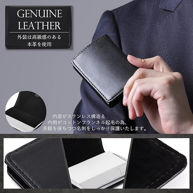 【機能・特徴】外装は本革製にすることによりデザイン性は崩さず、名刺収納部をステンレス、内側にコットンフランネル起毛を使用することにより美観を保ちつつ名刺を保護いたします。