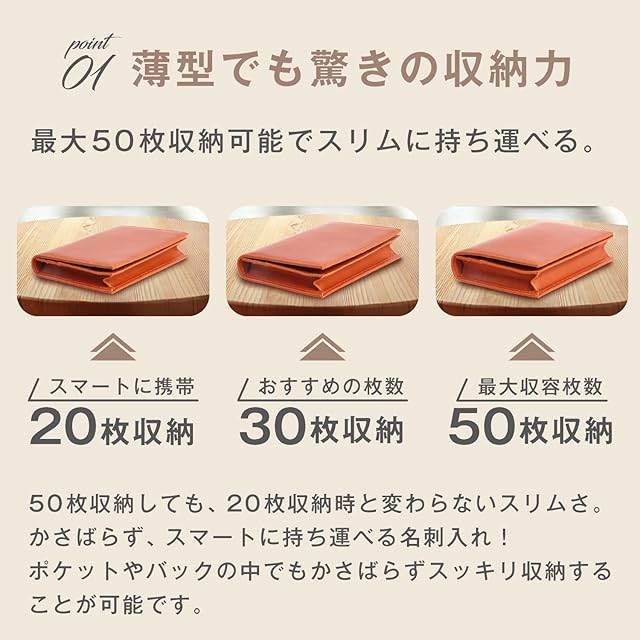 【最大50枚収納の大容量】厚手の名刺でも約50枚をしっかり収納。仕分けポケット付きで、自分用・相手用に整理可能です。