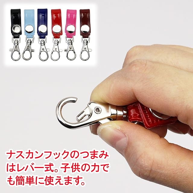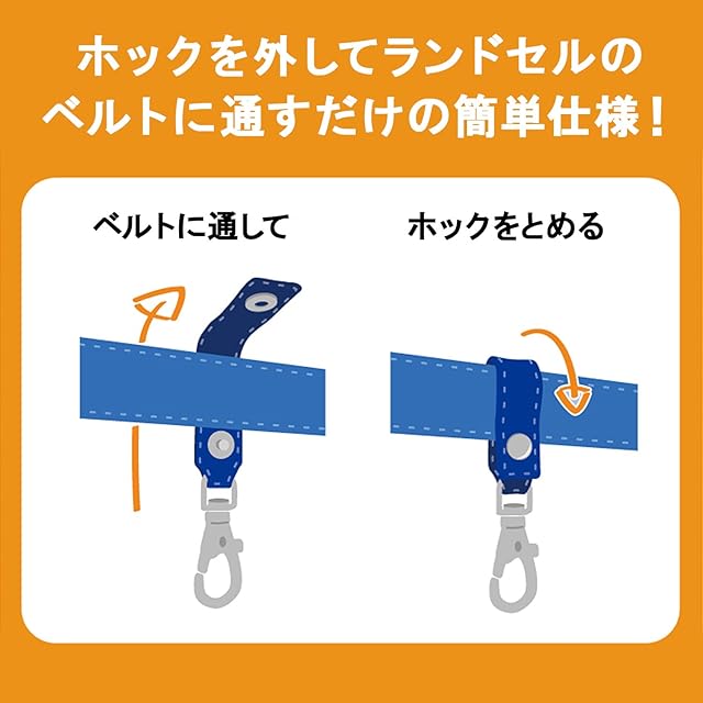 ランドセルのベルトに取り付けるだけ。あと付けできるナスカンフックです。