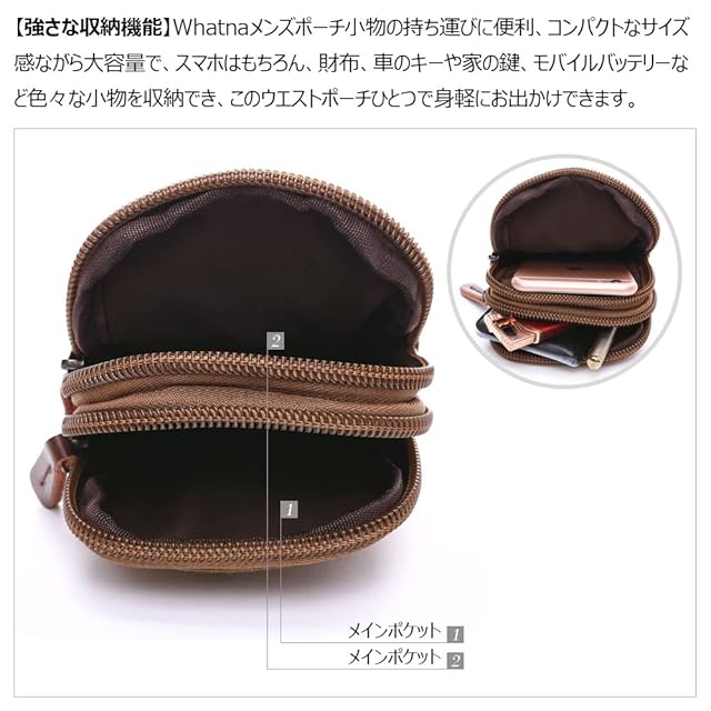 4.【強さな収納機能】Whatnaメンズポーチ小物の持ち運びに便利、コンパクトなサイズ感ながら大容量で、スマホはもちろん、財布、車のキーや家の鍵、モバイルバッテリーなど色々な小物を収納でき、このウエストポーチひとつで身軽にお出かけできます。