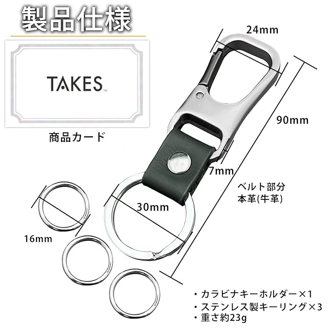【セット内容】カラビナ付き本革キーホルダー×1、ステンレス製ミニリング×3、商品カード付き(ブランド:TAKES)