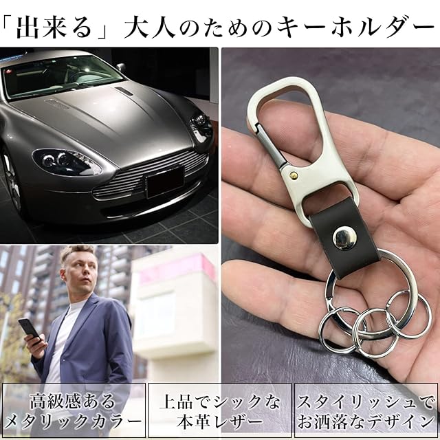 【カラビナ付きお洒落なキーホルダー】金属製キーホルダーに本革レザーを合わせたスタイリッシュなデザイン。カラーは落ち着きのある3色からお選びいただけます。