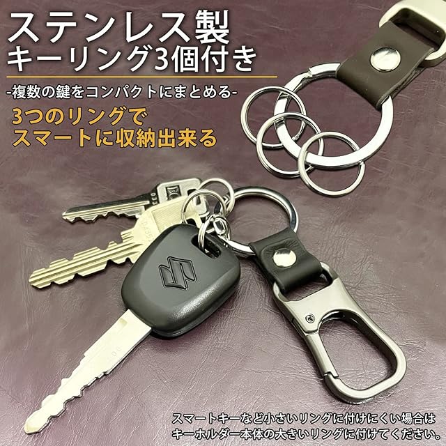 【ステンレス製キーリング3個付き】複数の鍵をスマートに収納出来る便利なステンレス製キーリング3個付き。