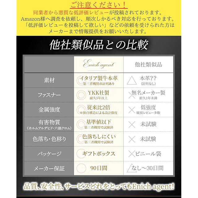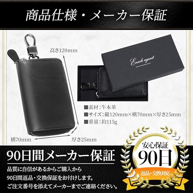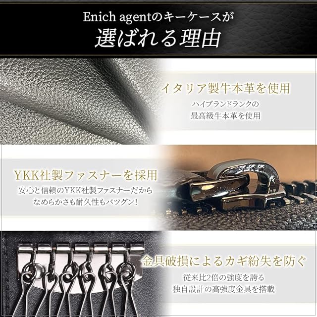 【安全な素材のみを使用】本革ならすべて安全だと思っていませんか?未試験の本革には残留化学物質(ホルムアルデヒド、六価クロム)などの有害物質が含まれる可能性があります。Enich agentのキーケースは第三者機関で試験を実施した安全な牛本革を使用しております。毎日使うものだから品質・安全に徹底的にこだわって設計・開発しました。