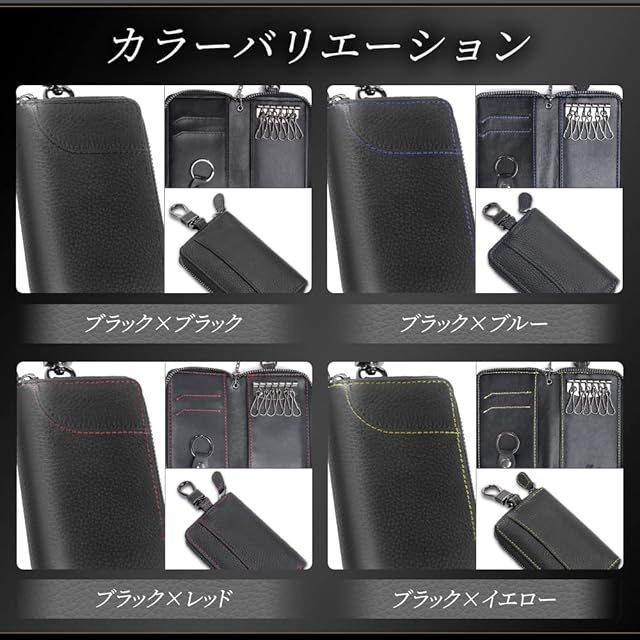 [Enich agent] 【GOODA掲載】 本革キーケース メンズ 6連 スマートキー カード収納 カラビナ付 イタリア製高級牛革 (ブラック × ブラック)