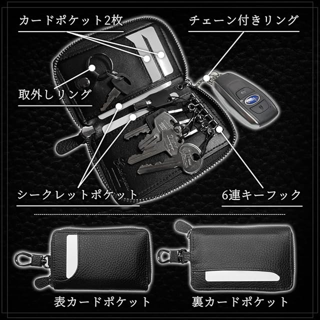 【充実の収納力】①6連キーフック、②取外しリング、③チェーン付きキーリング、④外側カードポケット(表裏両サイド)、⑤内側カードポケット(2枚)、⑥シークレットポケット(2か所)
