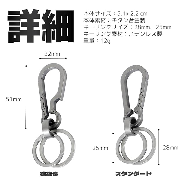 【詳細】本体サイズ:5.1x 2.2 cm 本体素材:チタン合金製 キーリングサイズ:28mm、25mm キーリング素材:ステンレス製 重量:12g