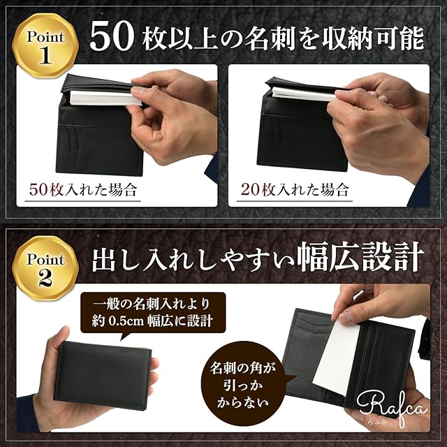 【大容量で出し入れしやすい幅広設計】メインポケットは収納力たっぷり。50枚以上の名刺をスッキリ収納でき、いざという時の名刺切れにさよなら。また、一般の名刺入れより約0.5cm幅広に設計することによりたった0.5cmですがこのゆとりを作る事で名刺の取り出しで引っ掛かりやモタつきを防ぎスマートな名刺交換を体感できます。