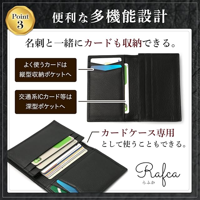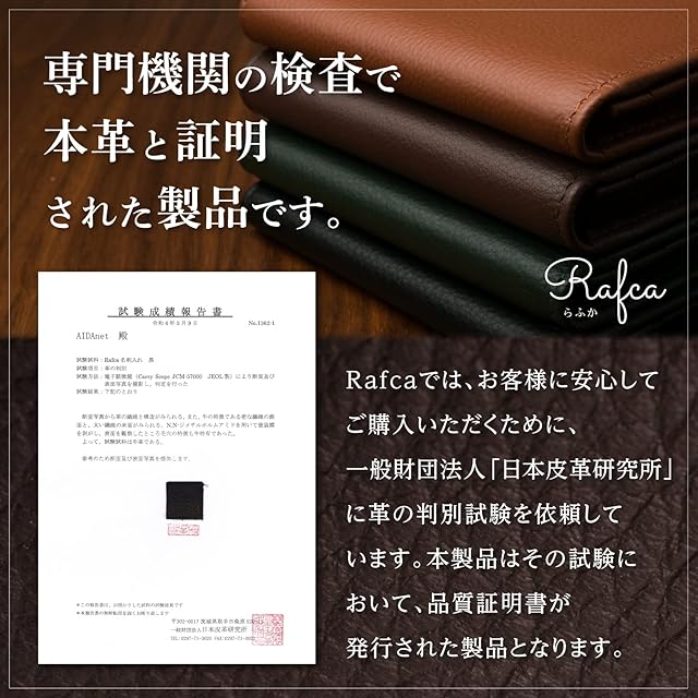 【本牛革/高級シュリンクレザー使用】Rafcaの名刺入れは柔らかくて手触りが良く、手に馴染む高級シュリンクレザーを採用しており、手にした瞬間から感動の使い心地をご体感いただけます。※日本皮革研究所による本革証明取得済です。