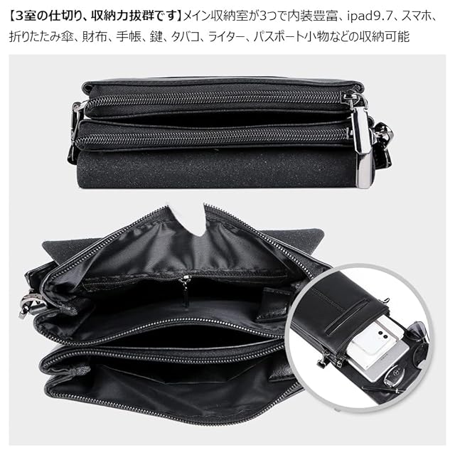 1、【3室の仕切り、収納力拔群です】メイン収納室が3つで内装豊富、ipad9.7、スマホ、折りたたみ傘、財布、手帳、鍵、タバコ、ライター、パスポート小物などの収納可能