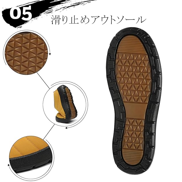 滑り止めアウトソール: アウトソールには二重滑り止めのゴム素材より出来ており、底部にも独特の滑り止めデザインが採用され、地面をガッチリクリップでき、心強く履いて頂けます
